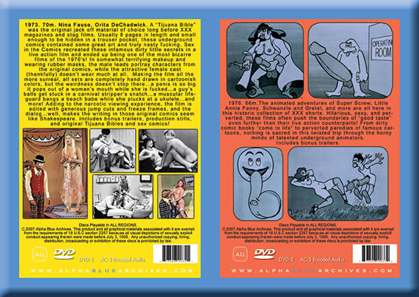 A “Tijuana Bible ” was the original jack off material of choice long before XXX magazines and stag films. Usually 8 pages in length and small enough to be hidden in a trouser pocket, these underground comics contained some great art and truly nasty fucking. Sex in the Comics recreated these infamous dirty little secrets in a live action film and ended up being one of the most bizarre films of the 1970s! In somewhat terrifying makeup and wearing rubber masks, the male leads portray characters from the original comics, while the attractive female cast (thankfully) doesn’t wear much at all. Making the film all the more surreal, all sets are completely hand drawn in cartoonish colors, but the weirdness doesn’t stop there a penis is so big it pops out of a woman’s mouth while she is fucked a guy’s balls get stuck in a carnival stripper’s snatch a muscular lifeguard bangs a beach babe while she plucks at a ukulele and more! Adding to the narcotic viewing experience, the film is edited with generous jump cuts and freeze frames, and the dialog well, makes the writing in those original comics seem like Shakespeare. Includes bonus trailers, production stills, and original Tijuana Bibles and sex comics!